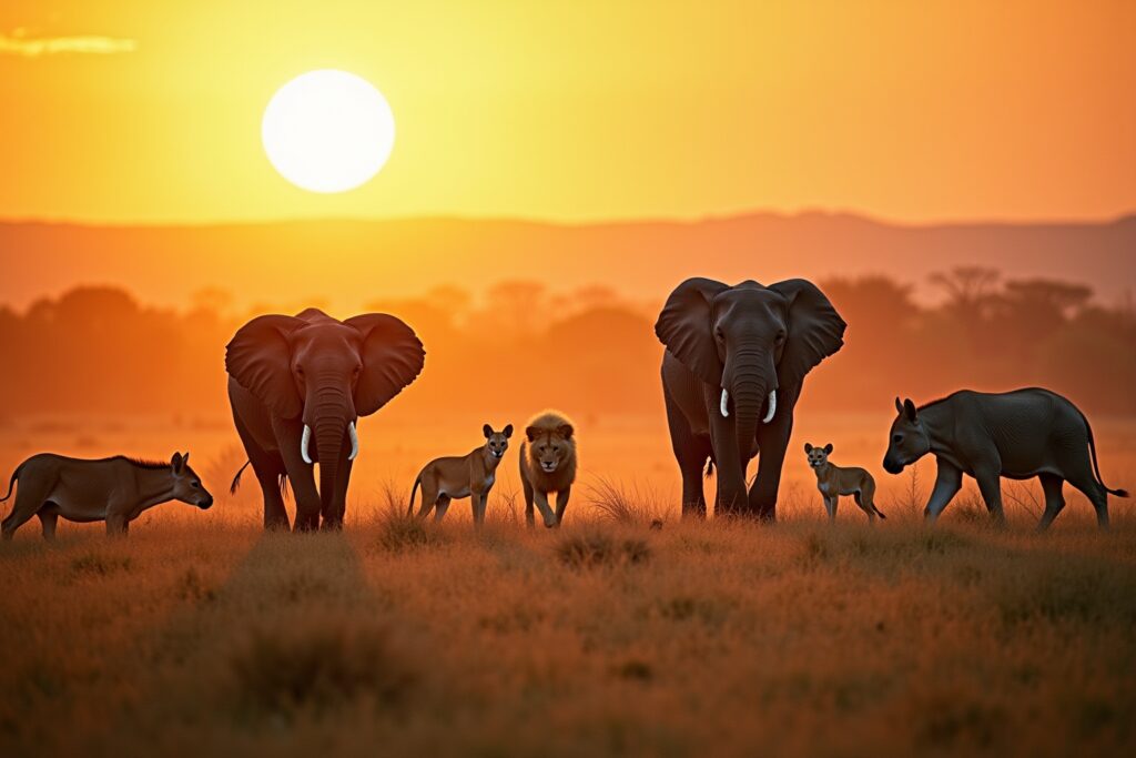 - Säugetiere: Löwen, Geparden, Leoparden, Elefanten, Giraffen, Zebras, Gnus, Antilopen, Büffel, Nashörner, Warzenschweine, Hyänen